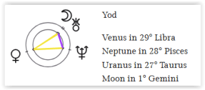 There is also a Yod (Finger of God) pointing to Venus in Libra.  It is based upon Neptune in Pisces and Uranus-Moon conjunction in Taurus.  This is Venus at 29o Libra at the cusp of Scorpio moving out of balance and into a conflicted heart in search of mystery, power, passion, and transformation through new alliances. It will be an intense time when suspicion, obsessions, jealousy, and fatal attraction may abound. This is already in full swing as we can readily see members of specific alliances jumping into the arms of former adversaries making very strange bedfellows.  Keep in mind the mysterious if not devious aspects of Scorpio as much of what we are witnessing is scripted or at least ordained to happen from a higher perspective.