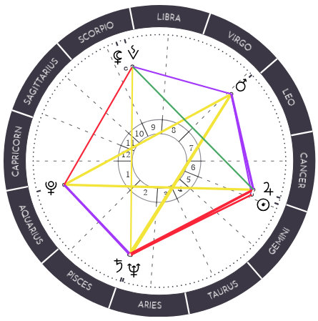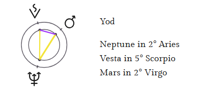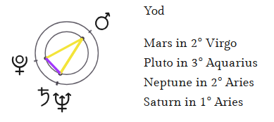 What is most astounding is that the central Mars-Pluto-(Neptune-Saturn) Yod is enhanced by two additional Yods. One pointing to Pluto, which is quincunx to Mars, and a Jupiter-Sun conjunction 0-2o Cancer.